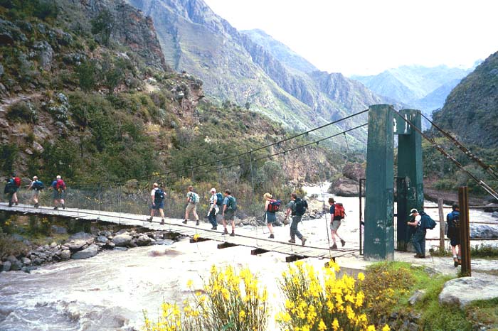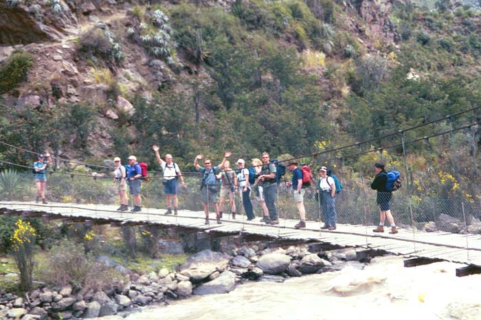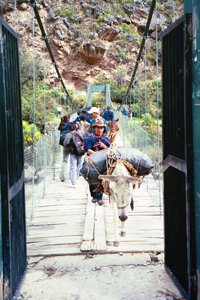Crossing the bridge over Urubamba river